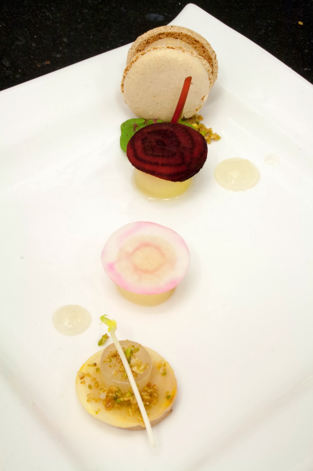 Plaats daarop de bietenschijfjes en werk af met de crumble, 2 dotjes appelgelei, de perengeleirondjes, een bietblaadje, een erwtasperge en last but not least de macaron met ganzenlever.