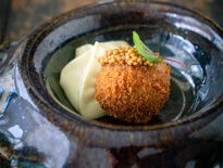 - Werk af met een plakje mortadella, een druppeltje balsamicocrème en een pistachenoot.