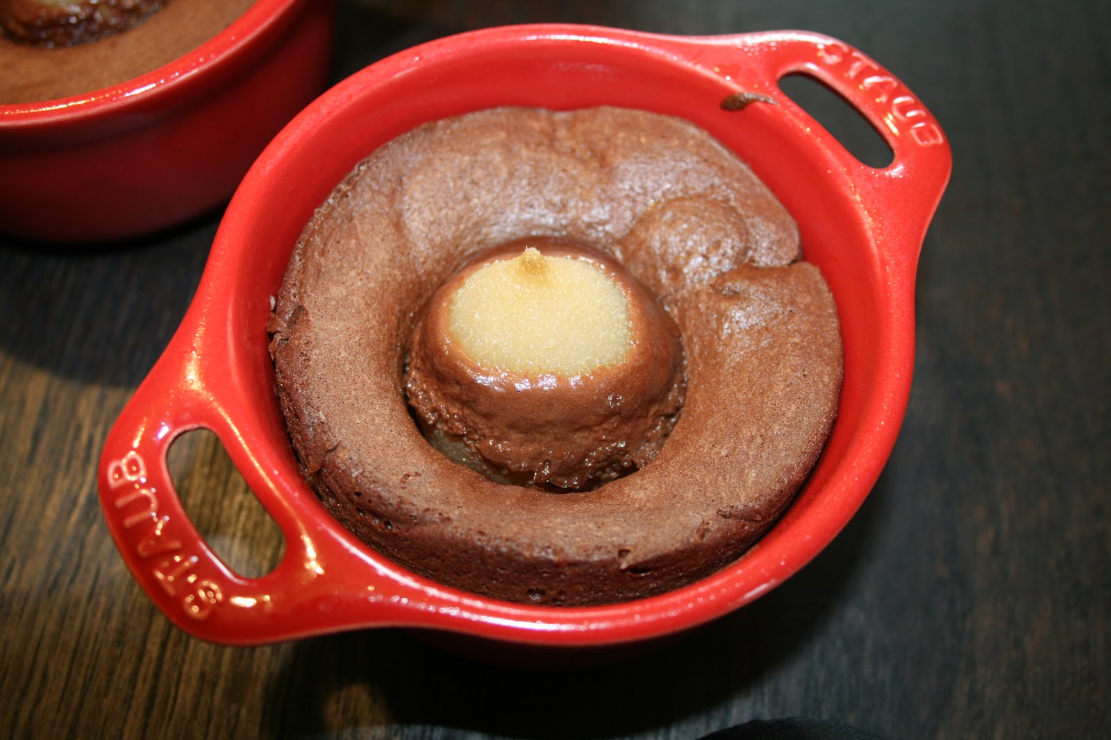 Boter de ministoofpotjes goed in met 25 g boter. Verwarm de oven voor op 180 °C. Laat in een kom 60 g boter smelten met een snuifje zout. Voeg de chocolade in stukjes toe en klop tot je een homogene massa bekomt. Voeg de bruine suiker en de bloem toe. Klop alles goed door. Voeg nu de eieren één voor één toe. Laat de peertjes uitlekken. Verdeel het taartbeslag in de ministoofpotjes tot op halve hoogte. Druk zachtjes 1 peertje in het midden van elk stoofpotje. Zet 20 minuten in de oven. De bovenkant van het taartje moet opbollen en openbarsten. Haal uit de oven en laat 2 uur afkoelen alvorens te serveren. Bron: een recept vertaald van de blog van Nathou.