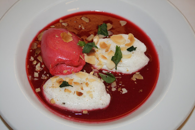 Werk af met amandelschilfers, fijngesnipperde muntblaadjes en een quenelle frambozensorbet.